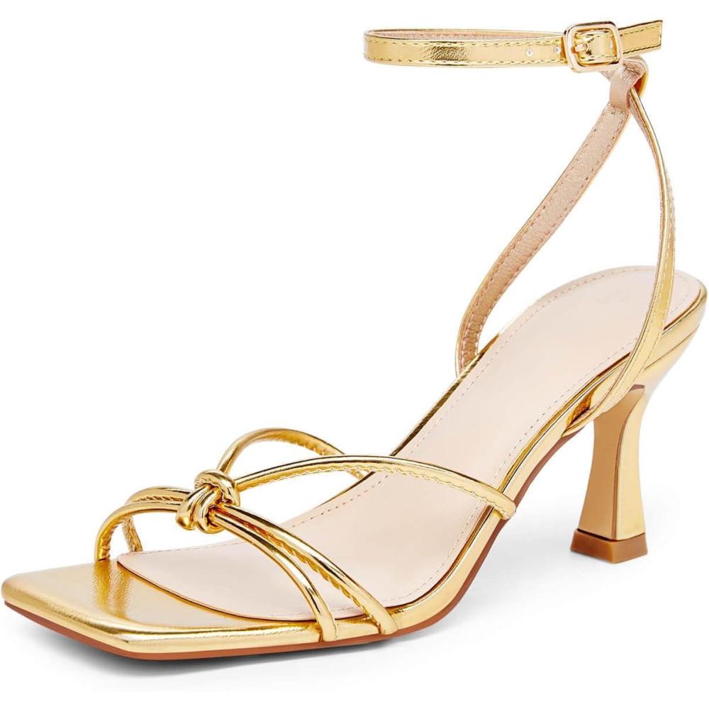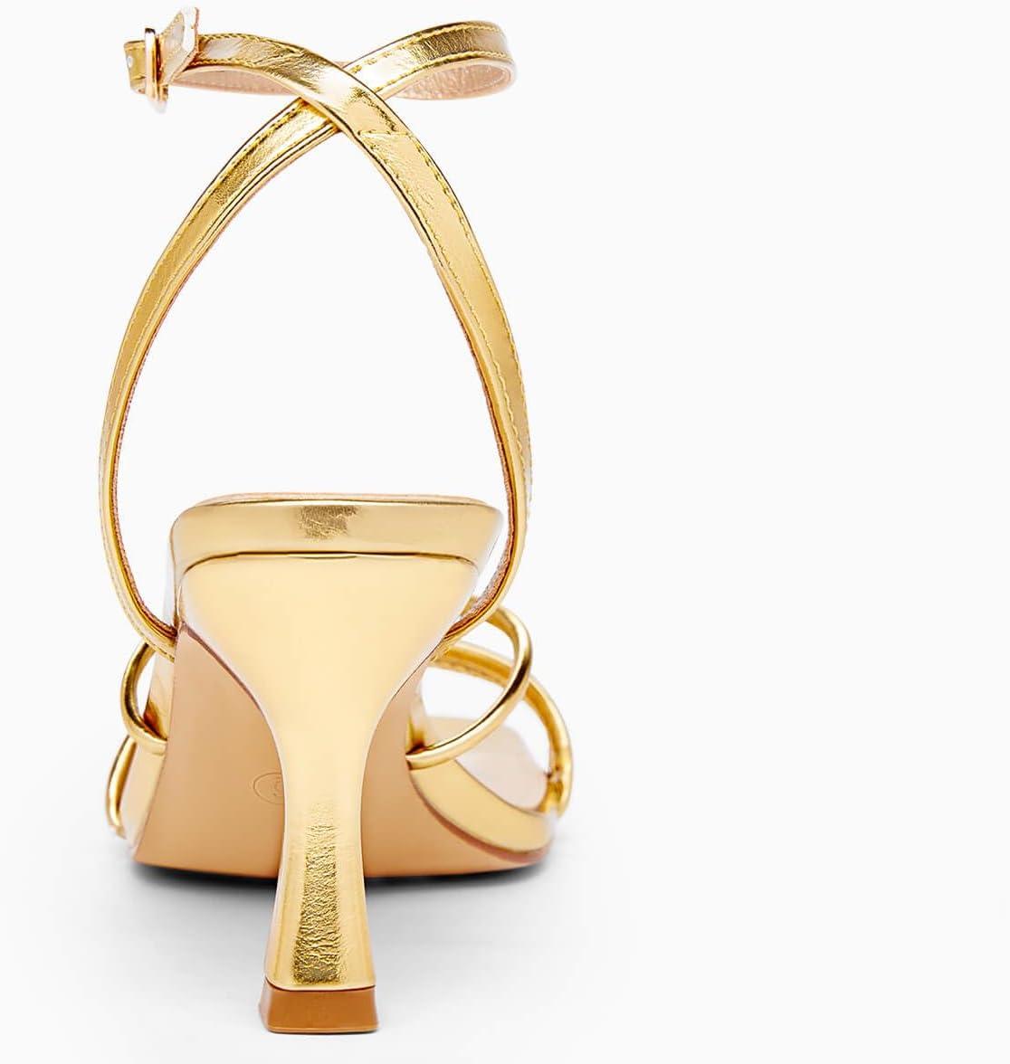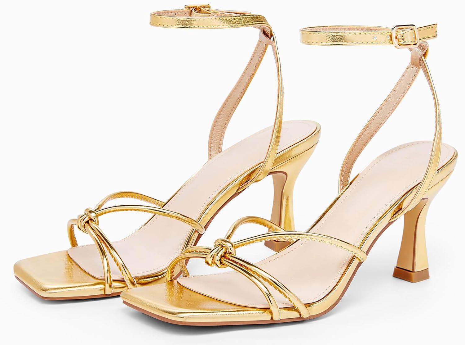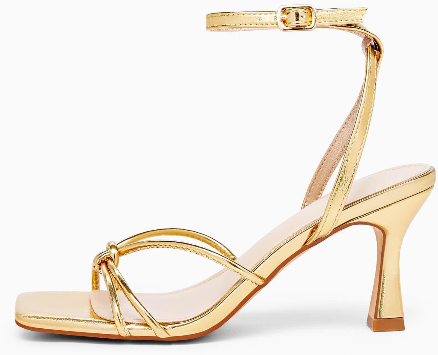 LAICIGO Women’s Square Open Toe Heeled Sandals Stiletto Kitten Heel Ankle Buckle Strap Slingback Summer Dress Sandals(Gold)